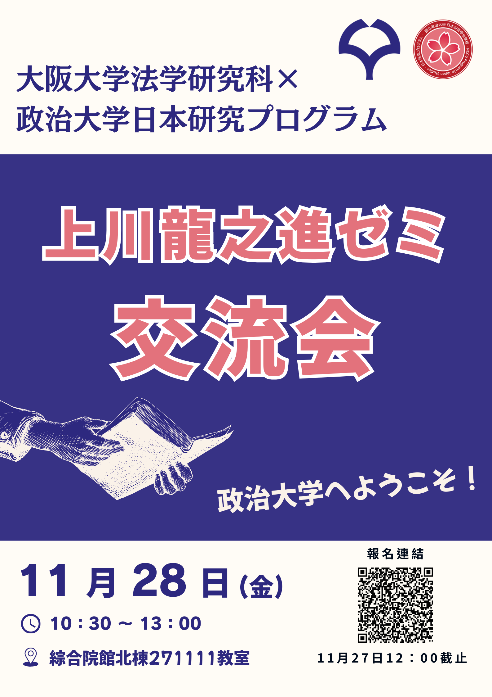 日本研究學位學程將於11月28日(五) 10:30舉行與大阪大學法學研究科上川龍之進教授學生的交流會。敬請各位踴躍報名