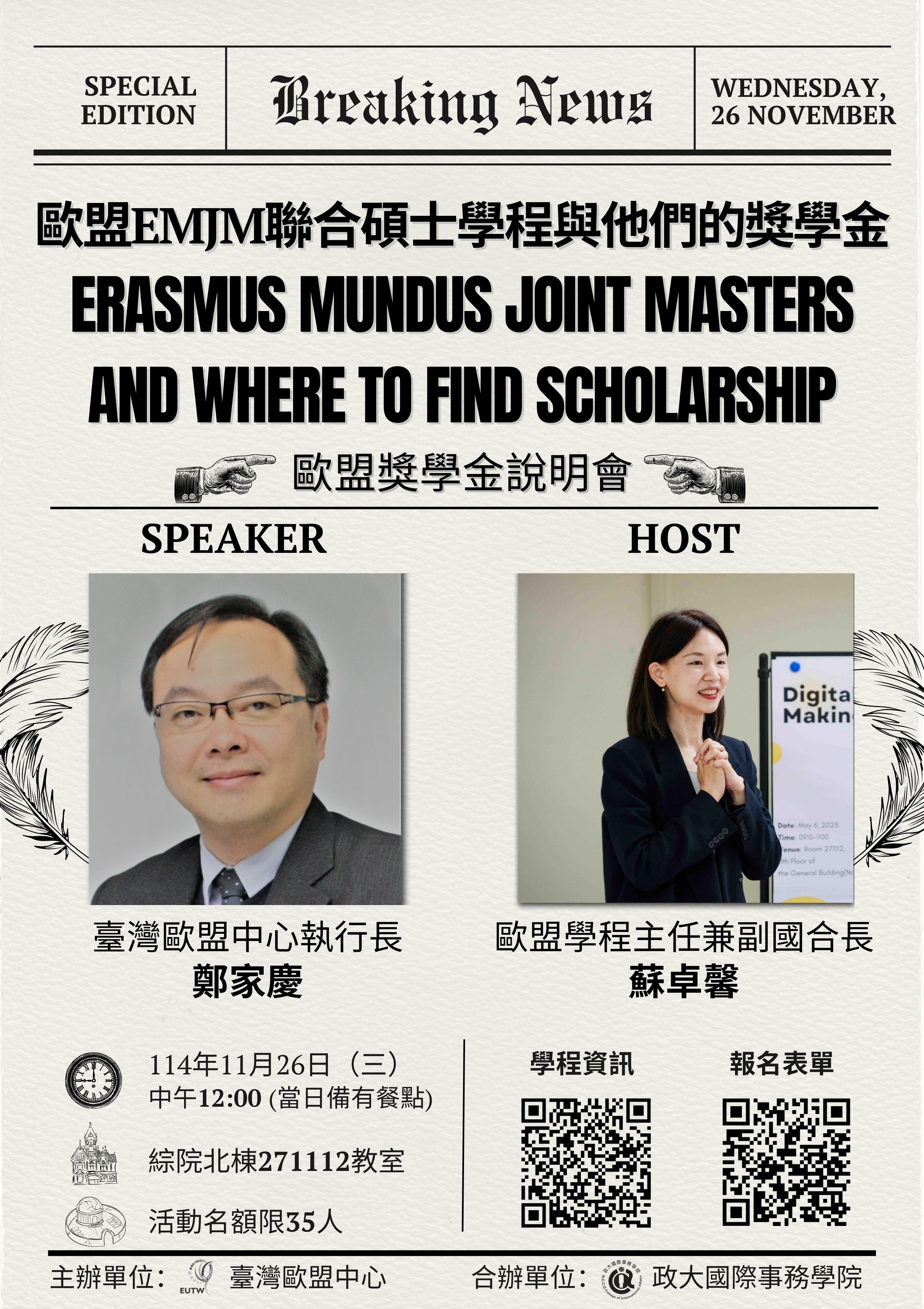【歐盟EMJM聯合碩士學程與他們的獎學金說明會】